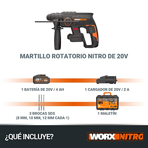 WORX WX381 Martillo ligero batería 20v Máx.Motor sin escobillas, perfora hormigón, mampostería y ladrillo de manera eficaz, hasta broca de 18mm, sistema anti vibración. 1 Batería 20V-4Ah y maletín
