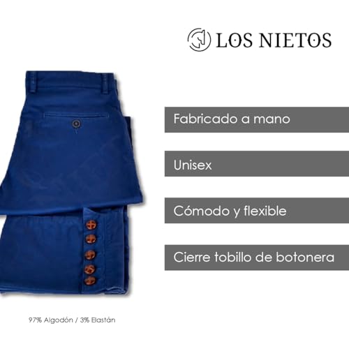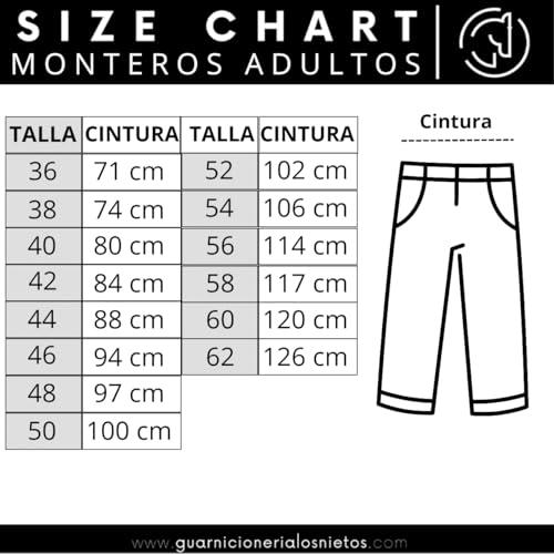 Pantalón Montero Unisex de Guarnicionería Los Nietos Descripción del Producto: Pantalón montero unisex, hecho en Priego de Córdoba, España. Cierre de botonera en el tobillo, posibilidad de cambiar por caireles al gusto. Cómodo y flexible. Composición: 97% Algodón / 3% Elastán Colores Disponibles: Gris plomo, gris, gris azulado, azul marino, azulina, camel, beig, verde militar, marrón, marrón oscuro. Tallas para Adultos: 36, 38, 40, 42, 44, 46, 48, 50, 52, 54, 56, 58, 60, 62. Recomendación: ELIJA UNA TALLA M