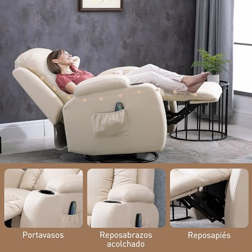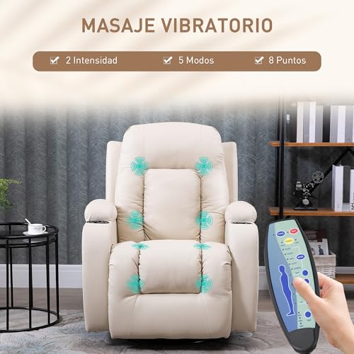 Homcom sillón de masaje giratorio con 8 puntos de masaje vibrante sillón relax reclinable con función de calefacción lumbar mando a distancia butaca reclinable para salón 85x94x104 cm crema
