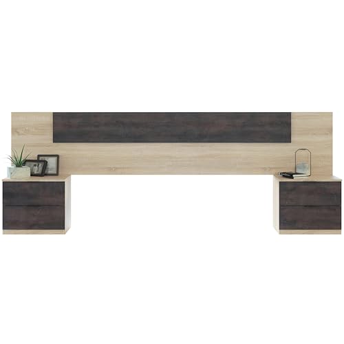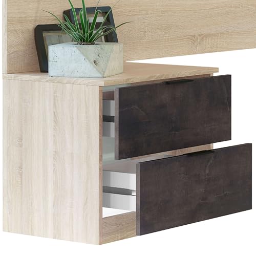 DUEHOME Cabecero para Cama de Matrimonio, dos Mesitas con dos Cajones en Color Oxido y Roble Canadian 150 cm