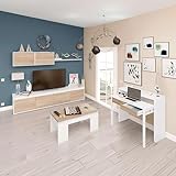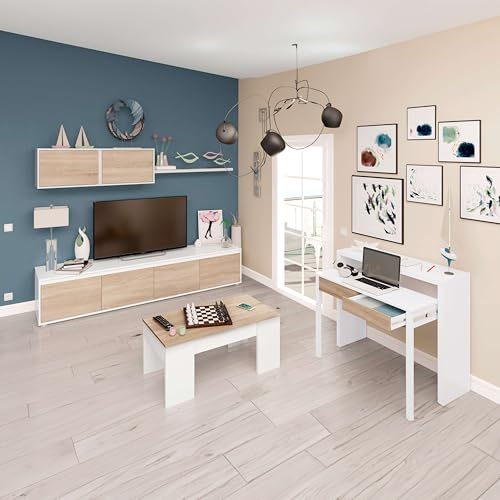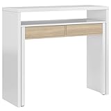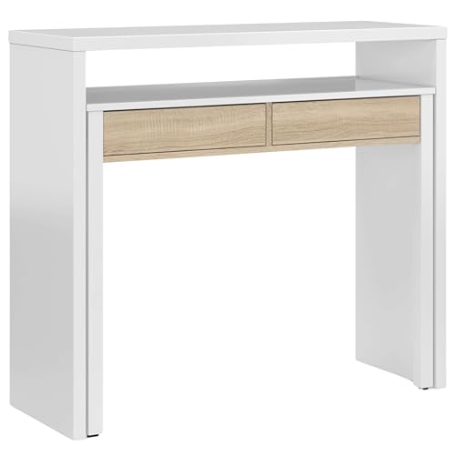 Habitdesign Mesa Escritorio Extensible, Mesa Estudio, Consola, Color Blanco Artik y Roble Canadian, Medidas: 98,5 cm (Largo) x 36-70 cm (Fondo) x 87,5 cm (Alto)