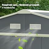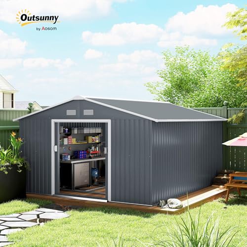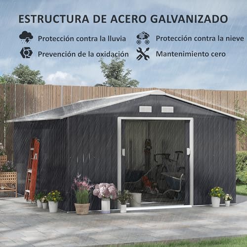 Outsunny caseta de jardín exterior 12,4 m² 340x386x200 cm cobertizo de jardín exterior metálico con techo de fibra de vidrio, puerta corredera, base refuerzo (suelo no incluido) y ventanas gris oscuro