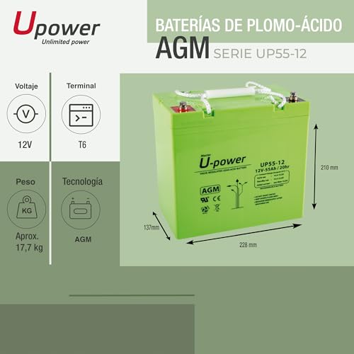 U-Power Batería AGM 12V 55Ah – Sellada Recargable Plomo-Ácido VRLA – para Alarmas, SAI/UPS, Energía Solar, Seguridad y Más – Terminal Tornillo Métrica M6