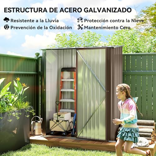 Outsunny Cobertizo de Jardín Exterior 1,34 m² 161,5x94,5x196 cm Caseta de Jardín Exterior Metálica con 1 Puerta y Cerradura para Almacenamiento de Herramientas para Patio Terraza Marrón