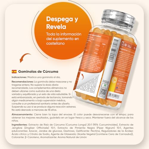 Gominolas de Cúrcuma - 2100 mg 90 unidades - Enriquecidas con Jengibre y Pimienta Negra - Delicioso Sabor a Limón