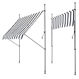 Toldo Este toldo es ideal para dar sombra a su jardín, balcones y terrazas y es muy fácil de montar.Con el brazo en el marco es muy fácil enrollar el toldo.La altura del toldo se puede ajustar entre 2 y 3 m, así cuando lo montamos, las barras telescópicas deben que fijar entre dos puntos por ejemplo entre el suelo y el techo.Aflojando los tornillos de fijación de las barras telescópicas es muy fácil ajustar la altitud más ideal y el ángul