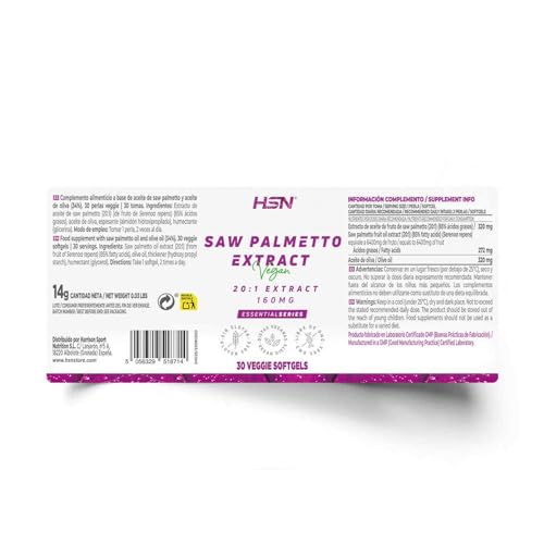 HSN Saw Palmetto 160mg - Serenoa repens – 100% Extracto de Baya | 30 Perlas Vegetales - 85% Ácidos Grasos (Ácido Oleico y Ácido laurico) - 20x Veces Más Concentrado | No-GMO, Vegano, Sin Gluten